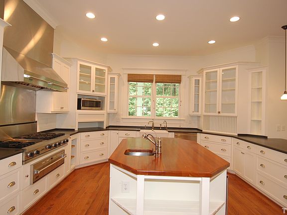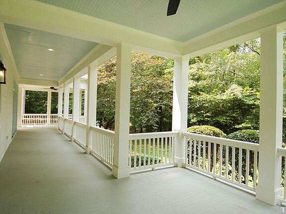 This picturesque Southern-style residence is set on 1.85 acres and features an expansive wrap-around porch and covered decking. Landscaping and gas services are included; only electricity is required as an additional utility. The impressive four-bedroom, four-bathroom home features hardwood flooring throughout the entire home, complemented by ten-foot ceilings and transom windows that enhance natural light. The ''dream'' kitchen is equipped with a huge walk-in pantry, double wall ovens, Wolf gas stove, SubZero refrigerator, and custom cabinetry with granite and wood countertops. Adjacent to the kitchen is a breakfast area and a sunroom. Through the butler's pantry is the formal dining room accented with elegant wainscoting. The study is richly appointed study with built-in shelving, and the den provides a relaxing space complete with a fireplace, built-in cabinetry, and a coffered ceiling. The owner's suite has its own fireplace and a spacious bath featuring an air massage tub, large shower, and double vanity. Three additional bedrooms also offer en suite baths, one is located on the main floor. The third floor presents a charming bonus room with vaulted ceiling and all board paneling. Residents can enjoy proximity to Falls Lake, renowned for its hiking and biking trails, fishing, and boating. This property offers the serenity of country living with convenient access to I-540, RDU, and RTP.