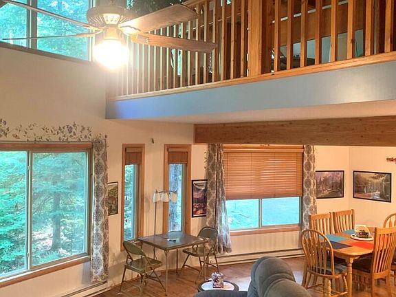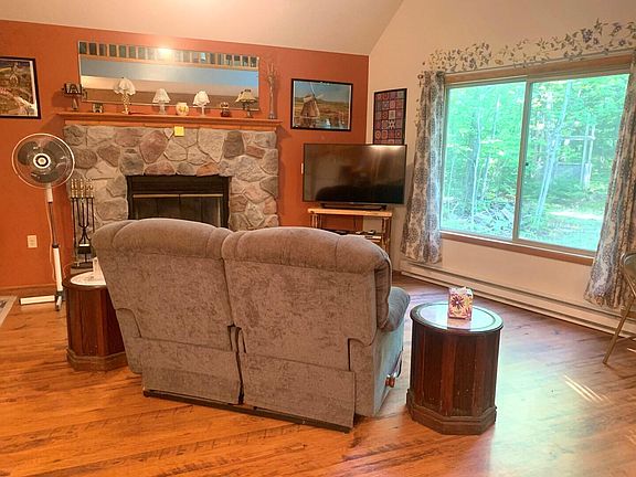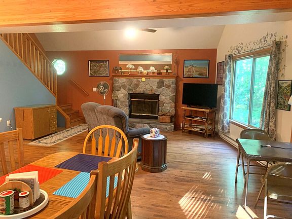 This is what Northern Michigan living is all about. 17 Acres bordering state land. Very woodsy and private yet only a few miles from the schools, access to I-75 and the Village of Roscommon. 2376 sq ft two story house has a ''prow'' front with wide open kitchen, dining and living room with vaulted ceilings and a beautiful stone fireplace. One bedroom on the main floor plus a family room/den also on the main floor while the second floor is open with a large loft area and two bedrooms and a full bath. The 2 bedrooms up each have a sliding glass door with private deck. The garage has 10 ft ceilings PLUS a large storage area above tall enough to walk around in. There is a mud room that opens to a nice stone patio. Lots of mature trees of various kind all through the property.