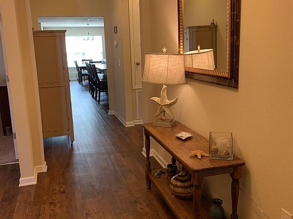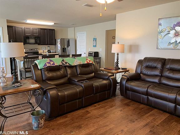 Beautiful 3 bedroom 2 bath home located in the heart of Foley situated at the mouth of a cul-de-sac cutting down on through traffic. This home has been well cared for and it shows. Home features wide entry way, spacious foyer, gorgeous wood-look vinyl plank floors, separate bedroom floor plan with bedroom 2 and 3 located near the front of home. Open floor plan makes it easy for entertaining and spending valuable time with family/friends. Master bedroom is located off dining area. Upon entry to master, master bath is breathtaking due to size, featuring two walk-in closets, separate toilet area, oversize shower and double vanity sinks. New ceiling fans, window blinds and new inset blinds on french doors per seller. Relax on the covered deck and enjoy the serene view of the large tree orchard from your backyard. Partial privacy fence in backyard but doesn't block orchard view. 10 x 16 shed makes it easy to store extra items. Home is priced to sell. Make an appointment with your favorite Realtor today to see this home. **house plans featured in the picture section is a "flipped" version with the garage being on the left side of the home. **