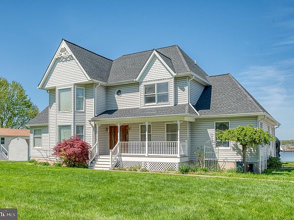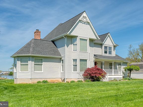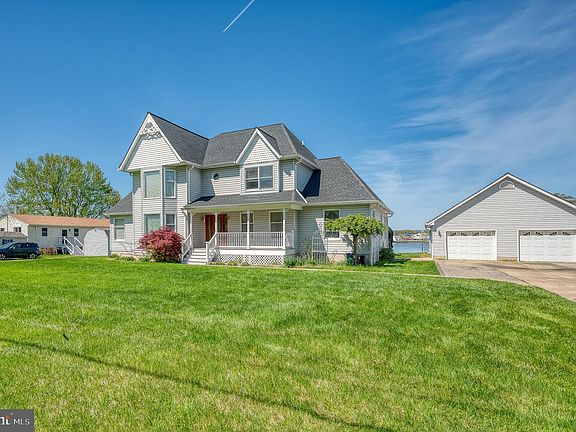 Welcome to this rarely available waterfront home on a double lot (3/4 acres) with private pier - complete with water and electric as well as three boat lifts (25,000 lb; 10,000 lb and 2800 lb). You'll find impressive exterior entertaining space with a tiki bar; firepit; maintenance-free deck and custom paver patio. There is a large shed for extra storage as well as an oversized two-car garage with electric and plumbing (including a powder room). The inside has much to offer as well: The covered front porch will lead you inside to a two-story foyer with hardwood flooring and fresh, neutral paint throughout the home. You'll find decorative moldings in the formal dining room to the right and living room to the left with bay window. Just off the living room, is a private office space with built-in shelves, cathedral ceiling and french doors to a maintenance-free deck. The oversized family room has a wood-burning fireplace and extra exit to the deck. The eat-in kitchen has maple cabinets and backsplash. The laundry is situated on the main level for added convenience. Tucked away, you'll find a versatile space that can be used as a bedroom or rec room (easy conversion to an in-law suite). Upstairs, the primary bedroom has a large walk-in closet, attached full bathroom with skylights, jacuzzi tub, shower and double sinks. Three more bedrooms complete the upper level - one with a private full bathroom and the other two share that share the full bathroom in the hall. Some recent upgrades include roof replacement (2019) and hot water heater (2018). This home is NOT in a special flood hazard area.