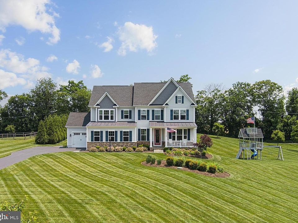 Welcome to 1020 Thunderbird Dr - a beautifully appointed 4-bedroom, 3.5-bath luxury home in the sought-after Fairlane Farm community. Nestled on 1.25 acres and set back on a prime lot, this NV Homes Longwood Model offers the perfect blend of space, comfort, and elegance in a peaceful setting. The main level features an open floor plan with hardwood floors throughout, a spacious family room with fireplace, and a gourmet kitchen equipped with a massive island, classic white cabinetry, tile backsplash, gas cooktop, double ovens, and new stainless steel refrigerator, dishwasher, and microwave. Additional highlights include a walk-in pantry, formal dining room with crown molding, private office with built-ins, a mudroom, and a stylish half bath. Upstairs, the primary suite boasts a tray ceiling, two walk-in closets, and a spa-like bath with soaking tub, dual vanity, and a tiled walk-in shower. Bedrooms two and three have walk-in closets and share a convenient Jack-and-Jill bath, while the fourth bedroom includes a walk-in closet and private en suite bath. The oversized laundry room adds everyday ease. The expansive lower level includes an unfinished basement with a designated play area, ready for storage and your finishing touches. Step outside to enjoy the screened porch, deck, and a custom patio with firepit added in 2020—perfect for relaxing or entertaining. Additional features include a storage shed (2022), a 2-car garage plus a separate carriage garage ideal for a third vehicle or workshop, epoxy garage floors, a new water heater (2025), and a playground (2023). Located in a vibrant community with top-rated schools and convenient access to major commuter routes, this exceptional home offers it all. Schedule your tour today!