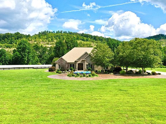 YOUR OWN PRIVATE EQUESTRIAN ESTATE WITH 22 STALL BARN (9,800+sq ft) sitting on 17.288(+/-) acres accompanied with a beautiful brick 4 bedroom & 3 Bathroom 1.5 story home with welcoming round driveway and fountain. Swing around back to private salt water in-ground pool with covered outside barbecue kitchen.Enjoy the 6,000 sq ft spray foam insulation detached garage with unfinished apartment. Fish the Big Sandy River by taking your own private concrete boat ramp. Horses love the 100'X260' Riding Ring. Underground Power. ONE OWNER! 20 Mins from Tri-State Airport and Yatesville Lake. Check out virtual matterport tours for main house and garage.