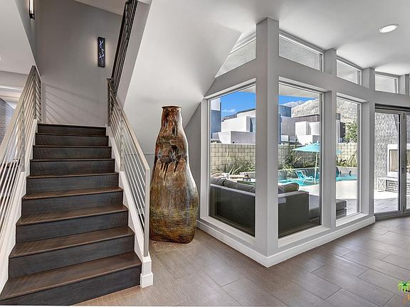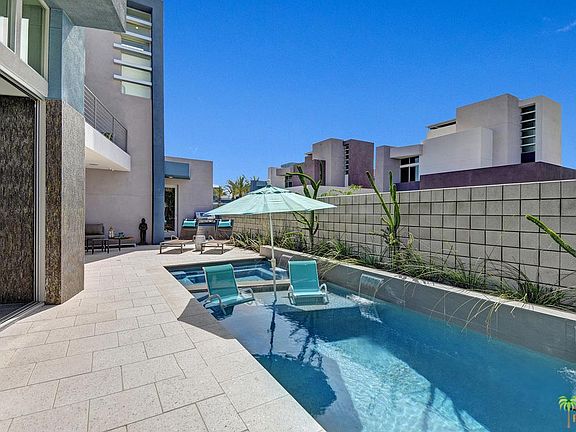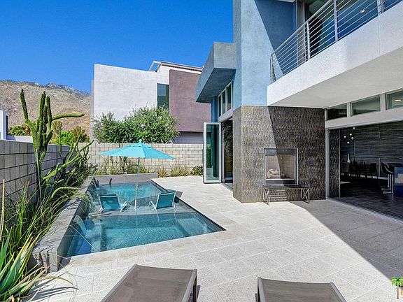 Located in the heart of Downtown Palm Springs, Sol delivers a new generation of living! New construction Plan-Two model home features 2,704 SF of modern living space. Featuring 10-14' ceilings, duel master suites showcasing dbl. vanities, soaking tub, walk-in showers & closets. A gourmet kitchen, powder room, media Rm./home-office, laundry Rm, 2 car garage & w/roof-top deck & endless Mt. views roundoff this amazing homes features. High-end finish details includes designer flooring, smooth-finish drywall & quartz countertops. Exterior elevations showcase strong architectural lines, energy/green features such as low-E glass, solar ready, 220v car charging stub & more. Slide open your 20'Nano door system & bring the outdoors in! The outdoor entertaining areas feature a private lanai with custom pavers, outdoor grill, fireplace, outdoor dining, pool/spa with Waterfall & stunning Mt. views all surrounded by an architectural zero-scape desert landscape, desert living at it's best.