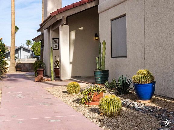 Amazing golf course & mountain views from this lovely 2BR/2BA townhome in Mesa Del Sol. Large office/den built off the master bedroom leading to a private courtyard & garage. Also has an amazing enclosed patio addition with wood plank vaulted ceilings. Kitchen & baths have been remodeled. Flooring is laminate throughout. Laundry & storage in garage. Sun screens to save on energy costs. HOA is $180/mo and includes a community pool! Furnishings available outside escrow. Call for your private showing today!