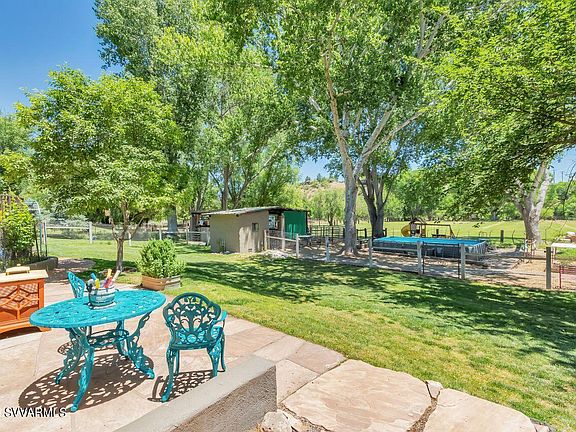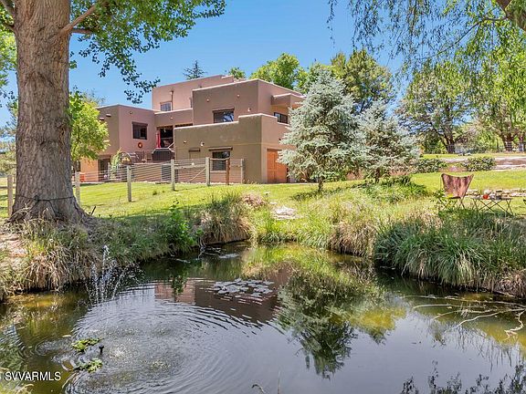 Welcome to your dream oasis in the heart of Cornville, AZ! Nestled on just over 3 acres of lush, irrigated property, this magnificent 6-bedroom, 3.5-bathroom Santa Fe style home offers a split floor plan and unparalleled privacy and tranquility. Situated on a private road with over 150' of frontage to Oak Creek, this property is a rare gem in today's market, perfect for those seeking a blend of luxury, nature, and sustainable living. Imagine enjoying the beauty of Oak Creek right in your backyard, providing a peaceful and private setting for relaxation and recreation. The expansive lot, with its lush green grass and mature trees, offers ample space for outdoor activities. The flood irrigation and automated drip/sprinkler system ensures your gardens and lawns stay vibrant year-round Bring your horses or other farm animals as the property includes well-maintained livestock stalls and cross fencing. Cultivate your green thumb in the dedicated garden area and harvest fresh fruits from your very own orchard. A picturesque pond with a charming solar operated water fountain adds to the property's allure, creating a serene focal point for outdoor gatherings.