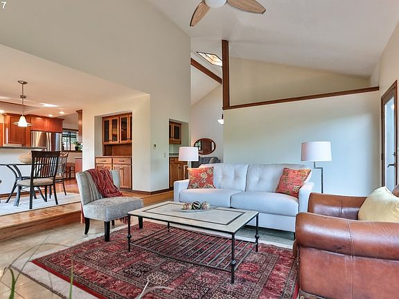 Tasteful in every detail: Skylights, vaults, ample windows-bright & open, gourmet kitchen,wood flrs,tile flr's w/radiant heat,fireplace & wood stove,new paint & carpet, remodeled baths, gorgeous stone paths,garden space, fenced level backyard, pvt with top of the trees view, 5 mi to I-5, quiet -tucked in the corner: no maint. metal roof