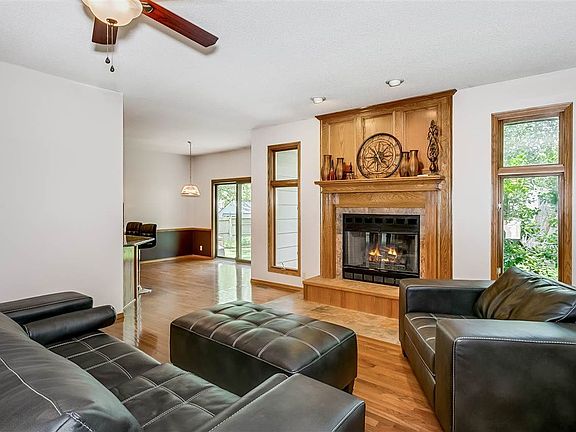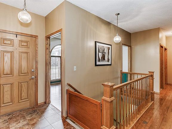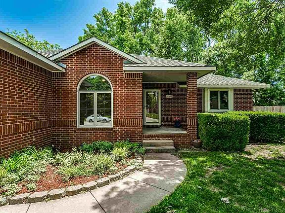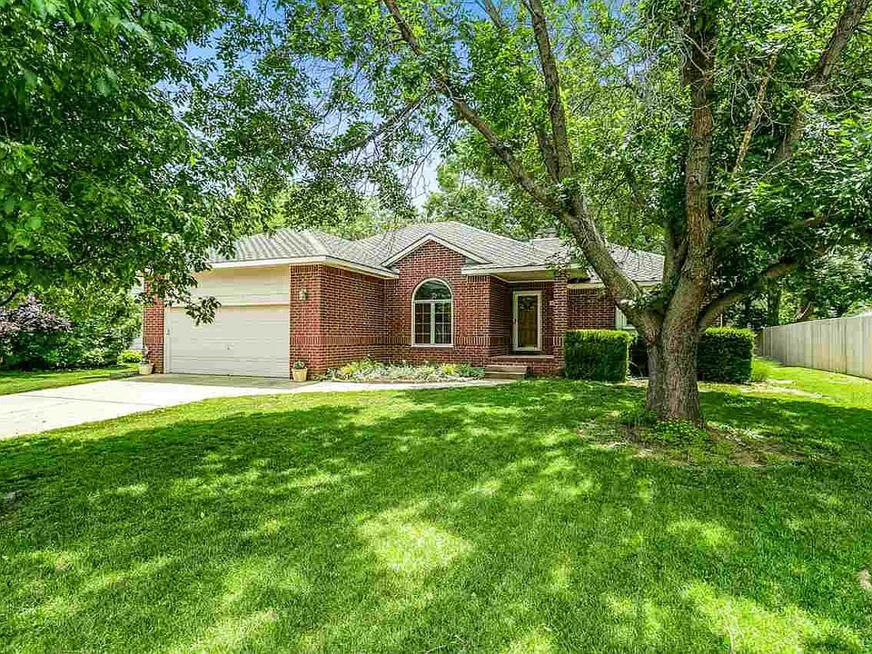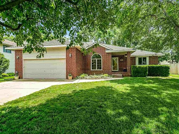 Beautiful one-owner, ranch home in Stonegate Estates. Highly desired neighborhood with Maize schools and no special taxes! The covered front porch greets your guests. Nice open floor plan with wood floors throughout majority of main floor living areas. New flooring in formal dining room and front bedroom. Several rooms have new paint and glass replaced in two windows. Large living room with high ceiling and beautiful gas fireplace. Updated kitchen with gorgeous granite countertops, inlaid tile back splash, eating bar, pantry, pull out shelves, stainless steel stove, dishwasher, and white refrigerator. Home features both informal and formal dining rooms. Two new Andersen sliding doors, one from the master bedroom and the other from the kitchen dining area, lead to the spacious 30 x10 concrete patio. Four bedrooms, 3 bathrooms plus an office and 2 car garage. Master bath has a double sink vanity, large bathroom window, jetted tub, private shower and toilet and spacious walk-in closet. You'll appreciate the main floor laundry with additional counter space and cabinetry. Basement offers tons of space for hanging out or entertaining. Oversized wet bar, beautiful brick fireplace and canned lighting. The wet bar has an abundance of cabinets and counter space; includes an oversized sink, microwave, mini refrigerator and built-in wine rack. Also at the lower level you will find a large 4th bedroom with two big closets, a 3rd full bath and an office featuring custom built-in desk, shelves and cabinets. Garage has built-in upper shelving, bike rack storage, and walls are insulated and sheetrocked. Several other features include brushed nickel light fixtures, 3 new ceiling fans, central vacuum, Christmas light soffit outlets and large unfinished storage room with built-in shelves. Mature trees, fenced yard with sprinkler system and nice landscaping.