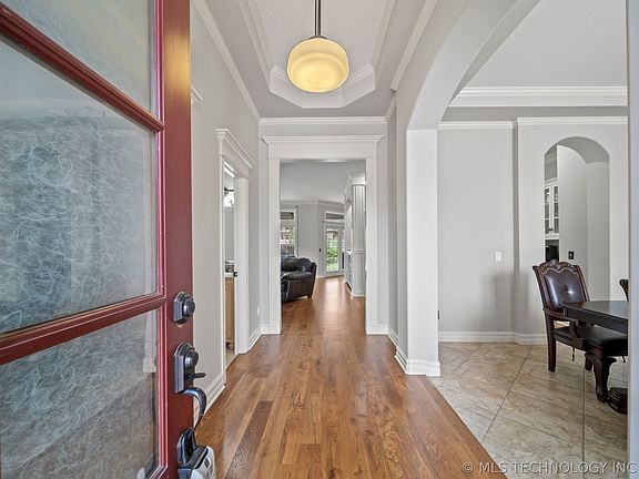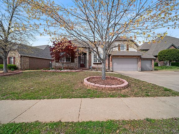 Boasting with Elegance this Legacy Park stunner will not want to be a home you miss. Featuring 6 bedrooms and 3.5 baths, oversized 3 car garage with storm shelter. This home exemplifies luxury living as you walk through the front door to the main level features a spacious formal office with pocket doors and closet. Large formal dining room, beautiful hardwoods throughout the first floor. Enjoy Vaulted ceilings in the Spacious living room with gas fireplace, picturesque views of the backyard through the wall of windows brings in so much natural light. Living room is open to Chef Style kitchen with granite throughout, Stainless appliances, island, eating area and pantry. Primary room and two bedrooms with pullman bath are featured downstairs. Relax in primary rooms spacious and elegant bathroom featuring double sinks, whirlpool tub, separate tile shower with his and her closets. Upstairs features two additional bedrooms, game room, full bath, and flex room. Beautifully landscaped backyard with covered patio perfect for entertaining. This home is located in the sought after Jenks Schools and is surrounded by restaurants, shops, and close proximity to River Walk. Enjoy a fantastic neighborhood with neighborhood park, pool, and trails.