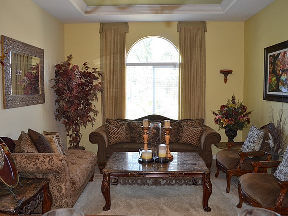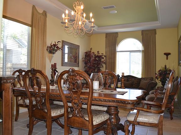 This former Model Home is upgraded throughout! Stamped concrete driveway, custom landscaping front and back w/ auto sprinklers & drip system, 16x16 tile flooring, crown molding, chair railing, tray ceilings, surround sound throughout home, whole house networked with Ethernet, custom drapery, wood burning fireplace, shutters, security system, Stainless Steel appliances, Upgraded Bisque White Kitchen Cabinets w/pull out drawers/shelves, upgraded counters with full backsplash, and gas range! WOW!!!