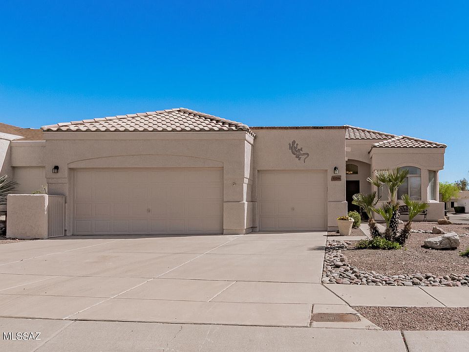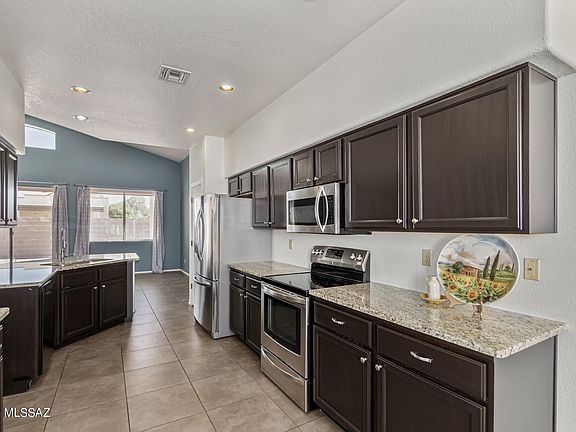 Welcome home! Comfort meets modern style in this charming residence in Pueblo Estrella At Rita Ranch. Nestled on a corner lot, this wonderful home catches the eye with a 3-car garage & a desert landscaped front yard. The inviting interior showcases vaulted ceilings, tile flooring in common areas, soft carpet in bedrooms, and tons of natural light. If entertaining is on your mind, you'll love the desirable great room! The kitchen boasts SS appliances, granite counters, dark wood cabinetry, recessed lighting, a pantry & a breakfast bar. The home also features a den with a double-doors, a master ensuite and a dual vanity guest bathroom. Come see this home today as it's sure to impress!