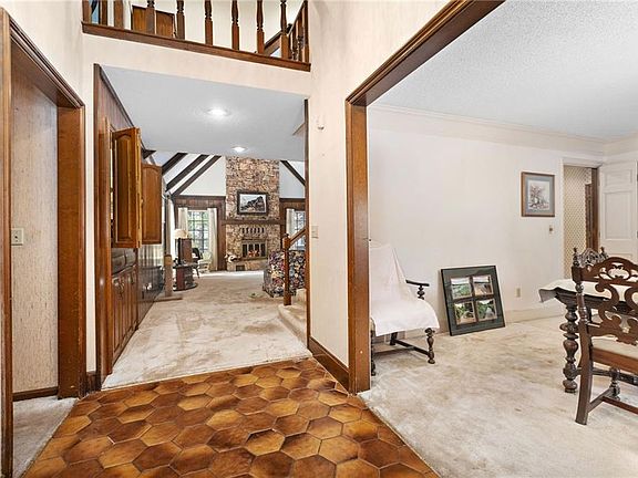 Tremendous character waits in this unique home! Stunning floor to ceiling fireplace in the living room with dramatic vaults and a balcony on the second story. Living room walks out to a nice brick patio, enclosed in the fenced in backyard. Two bedrooms on the main level, two dining areas, and an oversized 3 car garage. The full basement spans the entire foot print of the home and is ready for finishing touches! Taxes, square footage, and lot size are all approximate-not exact; Buyers and Buyer's Agents to verify all information provided.