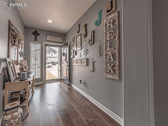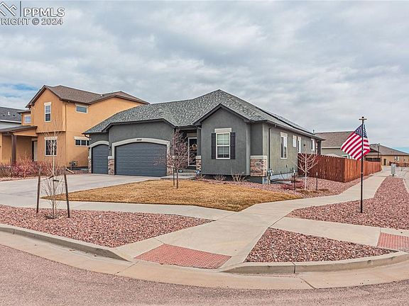 Stunning, Corner lot, 5 Bedroom Ranch styled single family home in highly sought after Meridian Ranch Community. This home offers over 3200 square ft. of living space equipped with large bedrooms and an oversized 3 car garage. Elongated Grand Entry with luxury Vinyl flooring throughout guides to open concept living enveloped with natural lighting. Main level with Guest bedroom and full bath. The focal point of the living room is a beautifully designed stacked stone fireplace. Kitchen offers a generous amount of cabinet space w/ hardware, pantry, Stainless Steel appliances, granite counters/glass tiled backsplash, farm sink, Island with seating, and glass sliding doors leading to a covered patio. Primary suite with walk-in closet and en-suite with granite double vanity, tiled flooring, and shower with a tiled decorative inlay. Full finished Basement does not disappoint offering an enormous 18’x23’ family room with projector and screen, extra storage area, full bath with granite and tile, and three additional bedrooms with ample storage. This home comes with solar panels and no finishes left untouched. The vibrant community in District 49 features parks, trails, clubhouse, indoor/outdoor pools, fitness center, recreation, and golf. Conveniently located near shopping centers, restaurants, and schools.