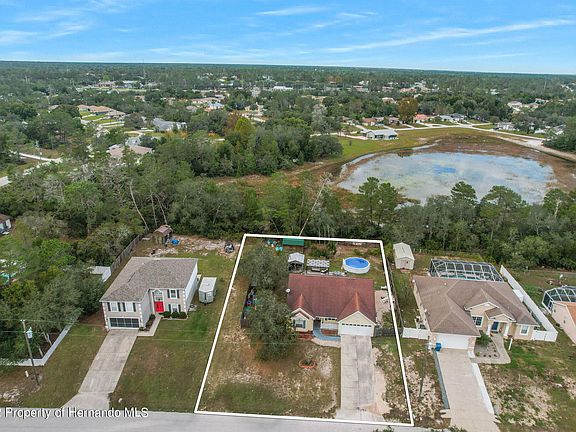 Charming home with front porch on a small lake in Spring Hill, close to everything! NEW ROOF GOING ON THE HOME AS PART OF THE SALE OR $10,000 credit to go towards the roof. !! Buyer can pick out the color of shingles if done quickly!! 4 bedrooms +upstairs bonus room + 2 bathrooms + 2 car garage + covered, screened-in lanai + fenced backyard + above ground pool + little tiki hut and patio by pool + shed!! NO HOA!!! NO FLOOD ZONE!!! NO REAR NEIGHBORS!! 1,794 sq ft living; 2,395 sq ft total. Kitchen is open to the great room and breakfast nook with high ceilings and breakfast bar. Formal dining room. Inside laundry room. Split floor plan for privacy for the master bedroom. Located minutes from kayaking the clear Weeki Wachee River, sunsets at Pine Island, restaurants, hospital, movies, shops, cafés, coffee shops and so much more! 10 minutes to the Suncoast Parkway for quick and easy access to Tamps for work and play!
