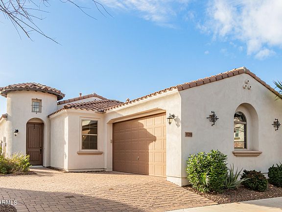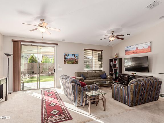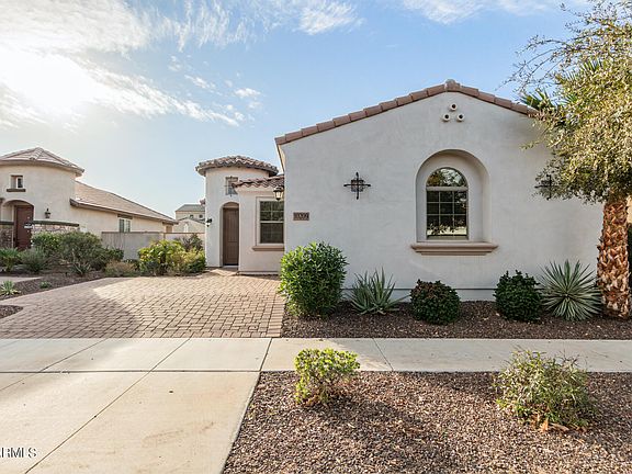 Welcome to this charming single-story home in the award-winning master community, Eastmark! This home provides 3 bedrooms + den/office that could convert into a bedroom, 2 bath, 2-car side garage complemented by a paver driveway & much more. Discover a delightful interior featuring carpet and tile flooring, vaulted ceilings, and a pre-wired surround sound that sets the stage for entertainment in the great room. The kitchen is a chef's delight, showcasing ample cabinets, built-in appliances, granite counters, a pantry, and an island with a breakfast bar - perfect for quick meals. Main bedroom is a serene sanctuary offering an ensuite with dual sinks and a walk-in closet. Step outside to enjoy the tranquil backyard that invites relaxation its covered patio, retractable sunshades, low-maintenance artificial turf and travertine to create a modern style yard perfect for entertainment. The backyard also provides you an assortment of trees such as Mexican lime tree, navel orange, daisy mandarin orange, ruby red grapefruit, and lemon tree.