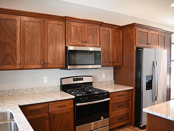 New Patio home with Granite Counter tops, Custom Cabinetry and Large Kitchen Island. Matching wood blinds throughout home, large walk-in closets, Stainless Steel Appliances, Never been Occupied. Garage is Insulated and sheet rocked and has loft storage area w/window. In ground Sprinkler system with Hoa maintained Lawn care and snow plowing. This well thought out development has a beautifully tree lined main drive with Sculptured neighborhoods, parks, and reserved wetlands, walking sidewalks and Trails throughout. its everything you have been looking for in a place to call home.