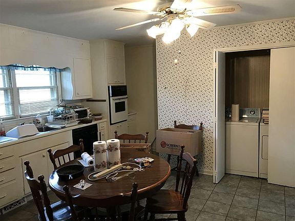 - KITCHEN DESC: Eat In Kitchen, Vinyl, Crown Mold, Ceiling Fan