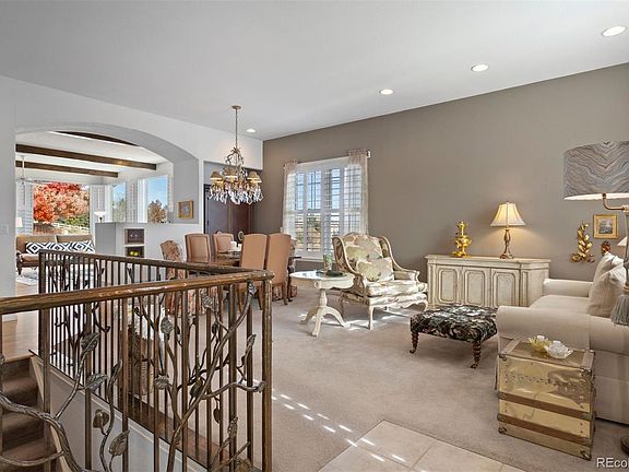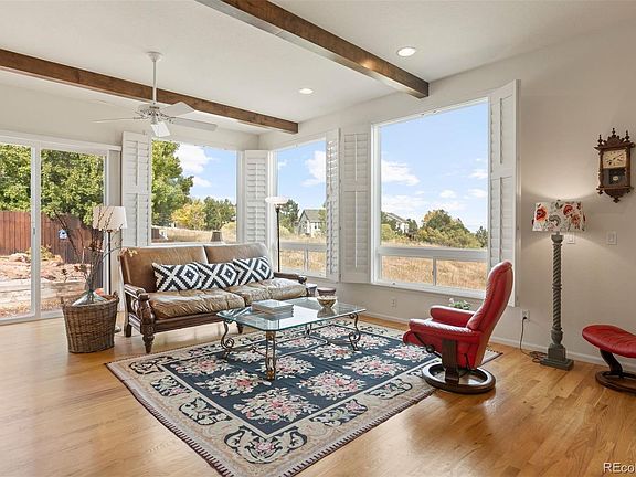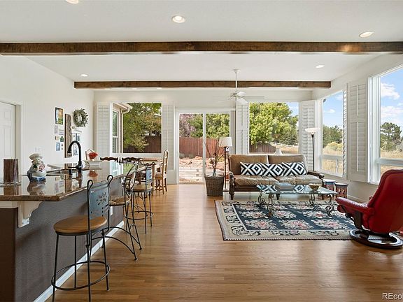 Come home to a peaceful retreat where the ease of main-floor living meets the beauty of Colorado’s landscape. Nestled beside serene, park-like open space, this home offers a sense of privacy and tranquility. Whether you're unwinding in the great room, with its expansive windows that bring the outdoors in, or enjoying the shady flagstone patio, the backdrop is quiet and calming. Lovingly cared for and upgraded with new windows, a new roof, plantation shutters, a new water heater, and other improvements, this home is move-in ready. Inside, you’re greeted by a bright, open floor plan, where natural light pours in through large, upgraded windows, showcasing views of the open space. The artisan-made staircase banister is a special custom feature, designed to resemble branches with delicate leaves, adding a personal touch to the home’s craftsmanship. The kitchen, with its granite and quartz countertops, large island, and dual ovens, flows seamlessly into the great room, where wood beams and a cozy gas fireplace create a warm and inviting atmosphere. The thoughtful layout includes a spacious primary bedroom, two additional bedrooms, and an office, offering the perfect blend of comfort and functionality. The fully finished basement provides ample space for entertainment, featuring a generously sized wet bar, pool table, and multiple sitting areas, making it the ideal spot for fun gatherings. This beautifully crafted home offers not just a place to live, but a setting to truly enjoy the Colorado lifestyle.