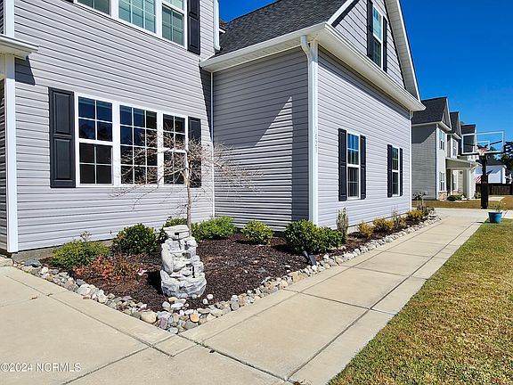 Welcome to the highly sought-after Bluewater Rise community! This stunning two-story home features a two-car side garage and 5 bedrooms, including two master suites one on the first floor and one on the second floor along with 4.5 baths, spanning over 3,300 sq. ft. The first floor boasts a formal dining room, a half bath, and a living room with a gas log fireplace and custom built-ins. The spacious kitchen features an island, generous cabinetry, granite countertops, a breakfast nook, and stainless-steel appliances, including a new fridge. The first-floor master suite includes a double sink vanity, separate soaking tub, walk-in shower, and a walk-in closet. Upstairs, you'll find 4 bedrooms with walk-in closets, two hall bathrooms, a laundry room, and the second master suite, which features a double sink vanity, linen closet, separate soaking tub, walk-in shower, spacious sitting area, and an expansive walk-in closet. The backyard is fully fenced and measures just under half an acre. It features a covered back porch and a large shed with a porch with electricity and internet access. The expanded driveway offers ample parking and includes a regulation-size adjustable basketball hoop. Ethernet wiring is available in the living room, downstairs master, upstairs master, and guest room. Conveniently located near Cherry Point MCAS, shopping, and downtown New Bern. Don't miss out on this exceptional home!
