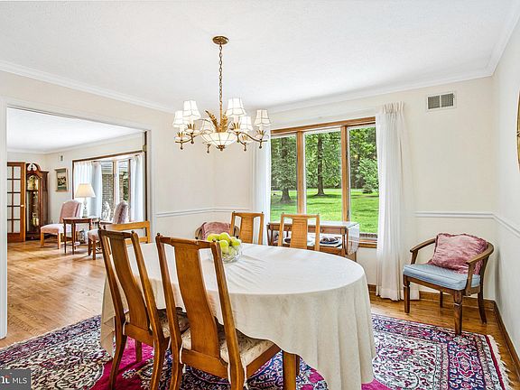 Discover this beautiful brick ranch-style home tucked away on a secluded 3-acre lot. Inside, you’ll find gleaming hardwood floors, elegant moldings, bay windows, French doors, and multiple skylights that fill the space with natural light. The open kitchen features granite countertops, an L-shaped island with cooktop, tiled backsplash, wall oven, convection microwave, pantry, and generous table space. Enjoy formal living and dining rooms with a two-way fireplace, a cozy family room, and a private office. The grand primary suite offers a walk-in dressing room with custom built-ins, plus a luxurious bath with a jetted tub and separate shower. The finished walk-out basement includes a bonus room (potential 6th bedroom), full bath, hobby/craft room, spacious rec room with wood stove insert, and a classic bar—ideal for entertaining. Additional highlights include an attached 2-car garage, detached 4-car garage, expansive driveway perfect for RVs, boats, or home business needs, multiple patios, and a deck. Located in a top-rated school district just 30 minutes from DC and the Beltway—with no HOA!