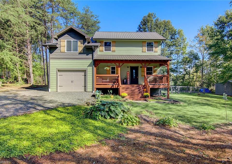 Fantastic opportunity to own this beautiful home in Yadkinville! With 3 bedrooms and 2.5 baths no detail was left behind. As you walk in from the covered front porch you are greeted with gorgeous hardwood floors that flow between the great room and kitchen with tongue and grove ceilings that give this home a cozy feeling. Great room has a wonderful wood stove. The kitchen has stunning hickory cabinets, tile backsplash, stainless steel appliances, and granite countertops. Laundry room has the potential to convert to a dining room. The primary has a beautiful tongue and grove vaulted ceiling, and LVP flooring. Relax in spa like primary bathroom, in the large bathtub. Two great sized bedrooms and additional full bathroom complete the upstairs. Enjoy these last warm nights sitting on the large back deck overlooking the fenced yard. Large storage building comes complete with power. This home is just a short drive to downtown Yadkinville and also Lake Hampton.