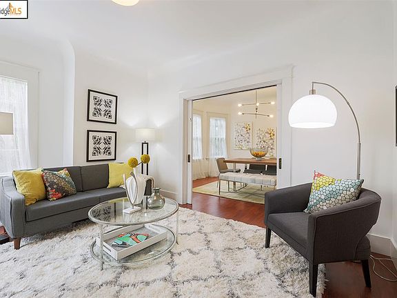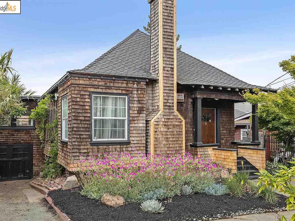 This handsome brown-shingled home is classic outside and full of charm and style inside. Maple, jasmine and succulents grace the front yard. Upon entering, arched windows, coved ceilings, stained glass and pocket doors are some of the original features. A big dining room connects to the kitchen, creating an inviting space for easy entertaining. Off the kitchen is a convenient pantry that leads outside to the back yard. A spacious bedroom in the back has a large window that captures the afternoon light and overlooks the garden. Up a step and through French doors is another light-filled bedroom, which could also be purposed as an office or nursery. Down the hall is the master suite, bright and airy, with a graceful window and an en-suite bathroom. Deep and sunny, the expansive back yard is a blank canvas waiting for inspiration. Trees around the perimeter bring privacy and a bricked patio is a sweet spot to savor the quiet. A laundry space and a roomy basement offer lots of storage.