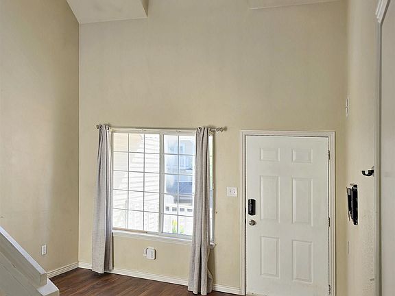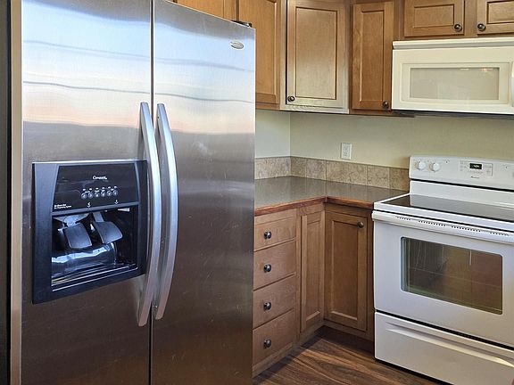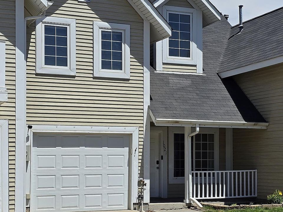 Starter home! Luxury laminate flooring, laminate countertops, laundry on upper floor next to the two bedrooms. The living room is a two story vaulted ceiling and large widow! The kitchen features dishwasher, refrigerator, electric range oven, microwave, stainless steal sink. One care garage has a work bench! Backyard has a small fire pit.
