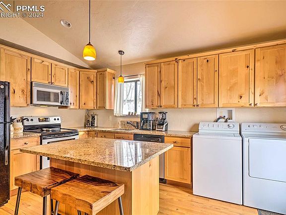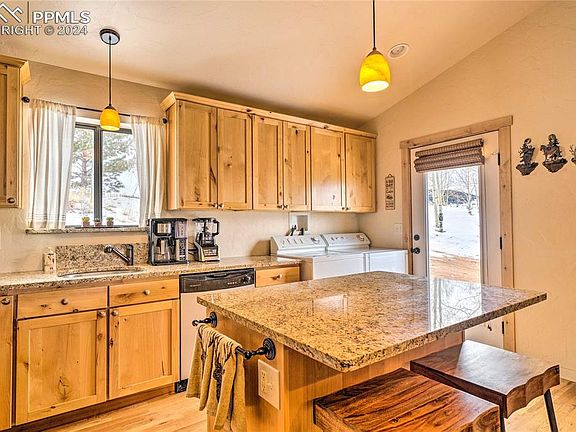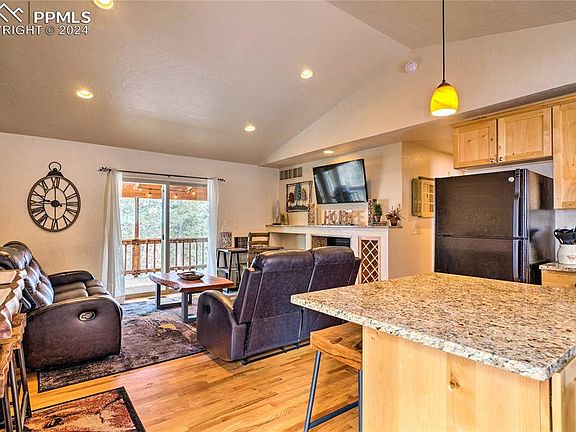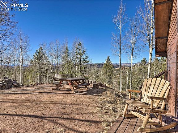 Beautiful mountain property with fantastic panoramic mountain views of the continental divide! Kitchen features granite countertops, hickory cabinets and island. Hardwood floors throughout, NEST thermometer and newer exterior stain. Enjoy your morning coffee on the oversized deck with gorgeous views. Keep warm in the winter with the double-sided wood fireplace (living room and main bedroom) and heated bathroom floors! New water heater in 2024. Home is located in the desired Cripple Creek Mountain Estates, only 15 minutes from Cripple Creek amenities. Cabin is an active vacation rental and being sold fully furnished. Neighborhood includes (owner use only) a community pool, fitness center, library, and fenced playground! Enjoy this cozy home year-round, a personal getaway and/or ST rental income!