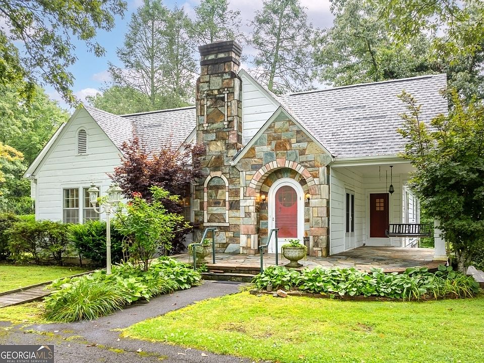 Welcome to your dream home! This enchanting vintage cottage, built in 1936, exudes timeless charm and character. Nestled on 6.38 level acres, this property is graced with huge oak trees, lush plants, and vibrant flowers, offering a picturesque setting. The main house features three bedrooms and 2.5 baths, while an additional apartment home offers one bedroom and one bath. As you approach, you are greeted by a prominent stone chimney and an inviting arched front door framed by a beautiful stone archway. A vintage-style lamppost lights your way along the walkway, leading to the front porch, where you can relax on the swing and soak in the tranquil surroundings. Step inside to discover original hardwood floors and high ceilings that enhance the spaciousness of the living room with ornate stone fireplace. Enter through charming French doors to find the spacious formal dining room with custom shelving and enormous windows, ideal for entertaining. The butler's pantry, located between the kitchen and dining room, offers additional space and cabinetry for staging dishes, glassware, and serving pieces. The expansive kitchen is equipped with loads of cabinets and updated stainless steel appliances. A separate laundry room adds to the convenience. The primary bedroom features an en-suite bathroom and a walk-in closet. Additionally, there is a second spacious bedroom with an adjoining bathroom and a third generously sized bedroom, perfect for versatile living arrangements. A bonus room upstairs provides ideal space for an office or extra storage. A full unfinished basement provides endless possibilities for customization to suit your needs. The apartment home, accessible via a separate entrance, offers a fully equipped kitchen, a sizeable living room, an ample bedroom with tray ceiling and a full bathroom. The property also includes a 2-car garage, ensuring plenty of space for vehicles and storage. Located between downtown Blue Ridge and McCaysville, this home offers the best of both worlds: a peaceful retreat with easy access to the vibrant dining and shopping in both towns. Schedule a viewing today and experience the timeless beauty and tranquility of this exceptional property.
