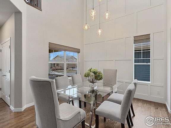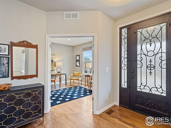 From the moment you walk through the custom front door into the formal entry, you will fall in love with this highly upgraded, center hall plan home. Hardwood floors throughout the main and upper levels. Soaring ceiling, custom light fixture & wainscoted walls in formal dining.Gourmet eat in kitchen with oversized center island, ss Kitchenaid appliances and butler's pantry overlook family room with corner fireplace.Primary bedroom has private sitting nook, 5 pc ba w/free-standing tub, European glass shower, large walk in closet and divided vanities. In addition to rms mentioned, there is a small loft study area w/mtn vus, workout room and wet bar in bsmt and back covered patio that runs the length of home with views of adjacent open space. Dual heating & a/c. 3 car tandem garage is heated. New humidifier. Within blocks of neighborhood pool, park, town rec center and library.