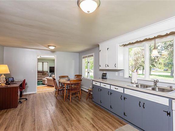Great approximate 1400 sq ft ranch with 3/4 acre lot. Home has huge kitchen with new flooring and large dinette area, opens to spacious living room with hardwoods and woodstove insert, tons of windows, most are newer, three bedrooms all with hardwood flooring, 1.5 baths, full basement with a walkout to rear lot, home is also zoned commercial so can be easily converted to additional uses, tons of parking, 2.5 car garage