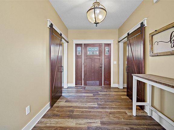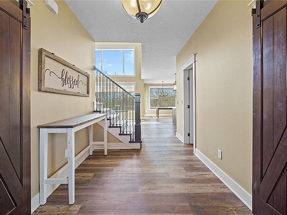 This luxury acreage close to the trails, has everything! Beautiful private setting with gorgeous views of trees and a pond. This better than new home has 5 large bedrooms with laundry, primary suite, office, huge kitchen and walk in pantry, and stunning floor to ceiling fireplace on the main floor. 3 additional bedrooms upstairs with bathroom and another laundry room! The lower level has a Huge family room, bedroom, wet bar, bathroom and a storage area that could be used for a work out room and still have plenty of space for lots of storage. Make this amazing dream home your own!