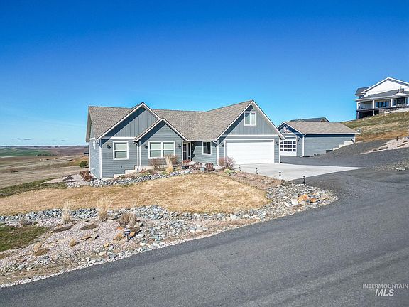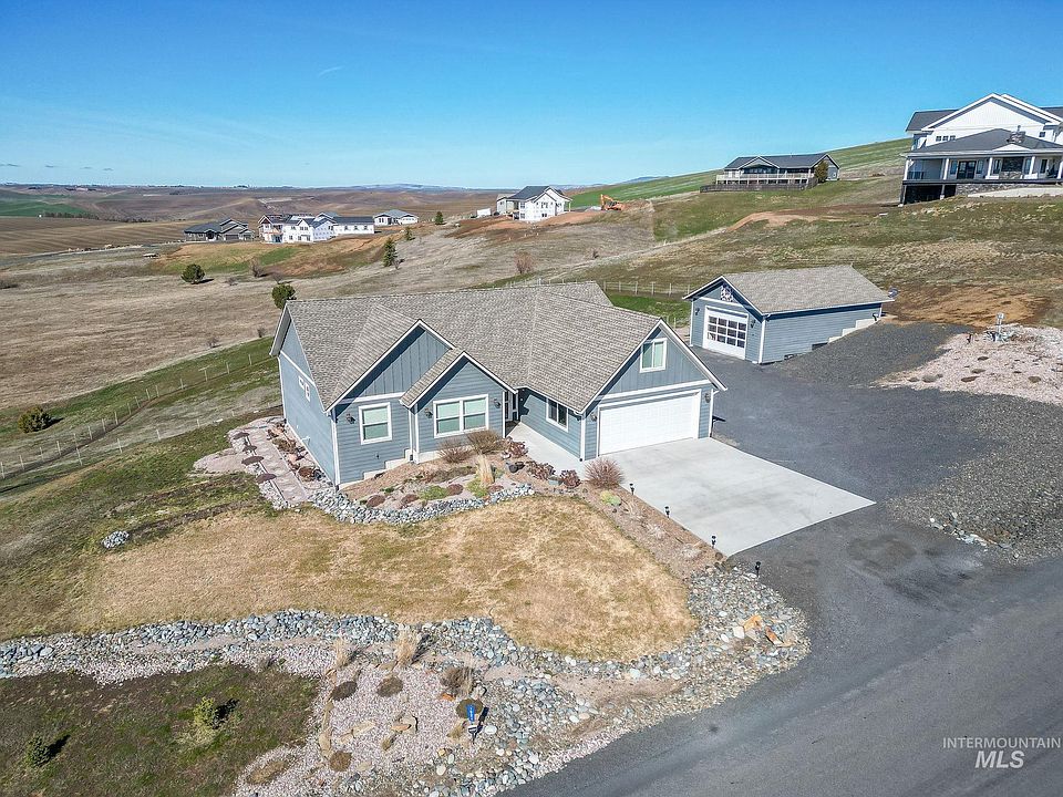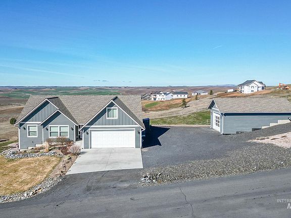 Enjoy all the comforts & amenities this one-owner, custom built home affords. Situated just 3 miles from Moscow & sits upon its own expansive 1.2 acre lot that loves to brag about its gorgeous sunsets & lingering views of the beautiful rolling hills. This perfectly sized home of 2,027 sq. ft. built in 2016, features nearly all one level living & affords open great room concept but fun space in bonus room over garage. Enjoy no steps into home, inviting wide foyer, leading to great room w/pretty hardwood floors, gas fireplace, & wall of windows to invite in the outside. Kitchen offers granite countertops, island w/bar height, great space for entertaining. All bedrooms are generous size w/master sharing the views, tile walk-in shower + soaker tub. Let's brag about the outside tho...THE SHOP! 24 x 36 with 12' ceilings, sprawling glass door offering abundant of natural light. Shop is insulated, inc. gas furnace + mini split A/C, H20 tank, utility sink + 1/2 bath, hot/cold spigot, all the perfect hobby space!
