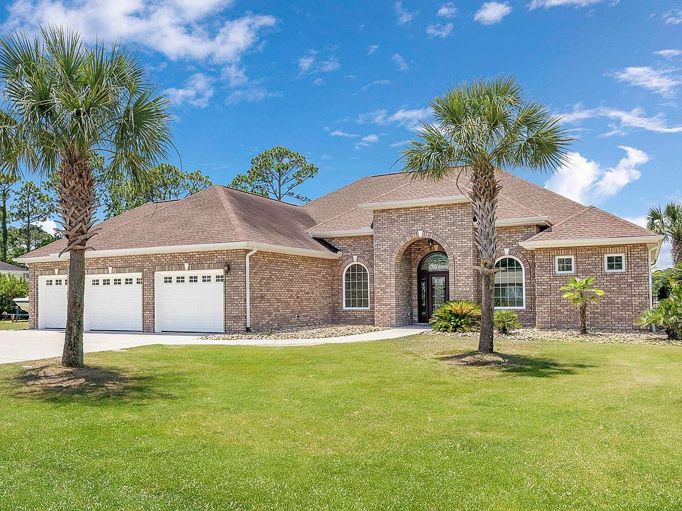 Stunning 4 BR/3BA/3CarGarage upgraded to the nines coastal style one-level custom all-brick executive home nestled on 1.5 lots (Lot 11 and .5 of Lot 12) in the heart of North Myrtle Beach. If you are looking for a home that will wow you and has everything, you have found it. Lusciously landscaped yard with river rock beds will grab your attention immediately with numerous Palm Trees, Palms, and other coastal beauties accenting the yard throughout the front, both sides, and the tastefully fenced in backyard, which is an absolute inviting oasis for even the most discerning buyers. Enter an amazing home through an elegant outside covered porch featuring beautiful tiled floor and spectacular cut-glass front door with matching side lights on either side and a matching style paladin transom. Quite an entrance! Enter on wood looking tile floors in foyer that flow seamlessly through the foyer, family room, dining room, kitchen, breakfast area, laundry room, flex room, Master bedroom, and halls. The only place you’ll find carpet is in 2 of the extra bedrooms. Entering your eyes will be drawn to the beautiful architectural design with columns, soaring ceilings, spacious, airy, bright, and light open floor plan and a wall of sliders on back wall providing phenomenal views of back yard boasting superb landscaping, lovely designed pool, covered paver decks and covered outdoor kitchen. To the left entering foyer, you will find a spacious Dining Room and straight ahead find a huge Family Room open to Kitchen and Breakfast area with sliders leading to upscale outside retreat area. The ceiling in the Family Room is gorgeous with high ceiling and design that sets the stage for rest of home. Kitchen boasts a chef’s delight with plenty of cabinets and granite topped counters/breakfast bar/ butler’s pantry, large separate pantry, bay window breakfast area overlooking back yard, stainless steel appliances to include a French Door Refrigerator/Freezer, double ovens, smooth top range, and dishwasher. Kitchen is awesome and the open concept is perfect for both inside and outside enjoyment and entertaining. Home is one level and features a true split bedroom plan with the huge Master Bedroom on the right back side with windows providing full views of fenced backyard, luscious landscaping, pool, outdoor kitchen covered paver patios, as well as a French door allowing direct access. Master boasts a large tray ceiling and Master Bath has left no stone unturned with two large granite topped sinks and a granite topped vanity area between them providing lots of drawers and cabinets for storage, soaking tub, huge tiled walk-in shower with 3 shower heads and seat for your luxury, linen closet, and an enormous custom walk-in closet . On other side of home find 2 other large bedrooms , each with their own closet and one has a full bath , while other has a full bath next door for convenience. If that’s not enough, there is a lovely flex room which also overlooks back yard and is perfect for 4th bedroom, office, den, or whatever meets your life style. There’s a huge tile laundry room perfectly located for convenience and a nice washer and dryer that convey. If you are energy conscious or just want to reduce your energy costs, this home has tented windows and a geothermal system that heats and cools the home, provides support to the hot water heater, and produces phenomenal affordable electric bills. Additionally, the home has been wired and boxes installed should you ever want to install solar panels and did I mention has an electric car charger in garage area and garages have insulated garage doors. This home truly is beautiful and has it all and more and is located in North Myrtle Beach and all it has to offer, golf cart ride to the ocean, golf, shopping, entertainment, restaurants, and no HOA fees! See this one you’ll want to call it home.