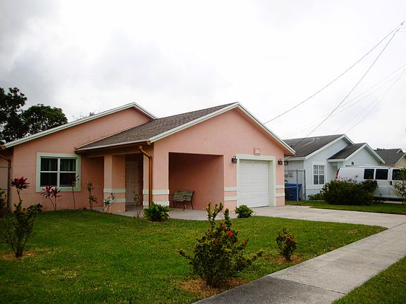 CBS home, 3 Bedrooms, 2 Bathrooms, 1 Car Garage with Covered Porch. The property features Impact Windows, 2021 Air Conditioner, Tankless Water Heater, Gutters, Sprinkler System. Vaulted ceiling, large Eat-in Kitchen, Fenced backyard, oversize garage with exterior side door. The house is across from Community Garden.