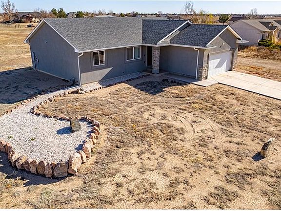Welcome to your perfect one-level living oasis! This pristine home, just three years young and lightly lived in, sits majestically on 1.03 acres of horse-friendly land, mere moments from the serene Pueblo Reservoir. As you approach, you're greeted by a decorative front entry door and a covered front entrance, setting the tone for the elegance that awaits within. Inside an inviting open great room concept, flooded with natural light streaming through oversized, 9' wide sliding glass doors in the dining area. Vaulted ceilings soar overhead, creating open concept. The heart of the home is the upgraded kitchen, beautiful cabinets with soft-close drawers, sleek granite counters, a convenient breakfast bar, stainless steel appliances. Smooth top electric range or there is gas plumbed in if you prefer. Retreat to the master suite, where a chic barn door to the master bath featuring decorative granite counters with double sinks and an oversized shower. Main level laundry room awaits with a convenient sink for added functionality. On the other side of the home, 2 additional bedrooms, and bath, providing comfort and privacy for family and guests. Elegant LVP flooring flows throughout the living spaces, offering durability and charm, plush carpeting provides comfort in the bedrooms. Central A/C keeping you cool on warm days, Ring doorbell alongside two exterior cameras providing added security and peace of mind. The garage, complete with a side entry door and south-facing driveway