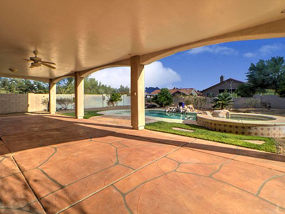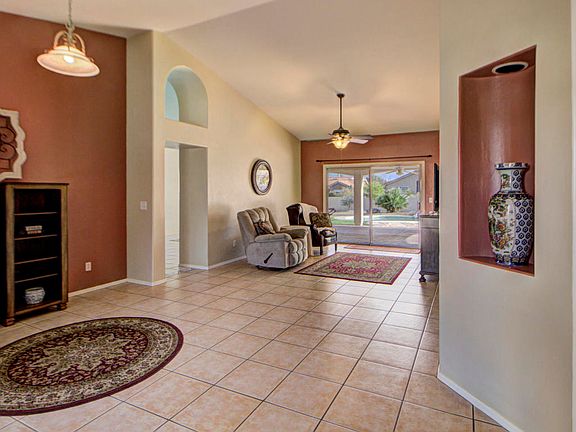 Lovely home has it all! Tile throughout, except bedrooms: master has new carpet with new laminate in the other 3 bedrooms. Quartz counters in kitchen that has been recently refreshed and opens to dining area and family room. Formal living and dining rooms lead to a big backyard with huge covered patio, pool, spa, and mountain views. Pool was replastered and new tile added 2018. There is a mature grape vine with a new pergola which nicely camouflages the pool equipment. Nice master suite with big walk-in shower and a closet the size of a bedroom. New roof Fall, 2019. There is no HOA or GVR to worry about.