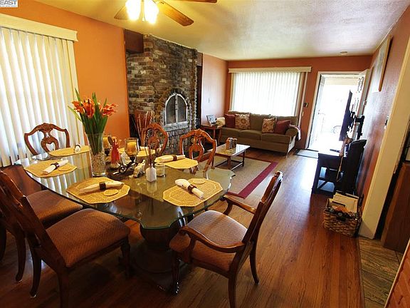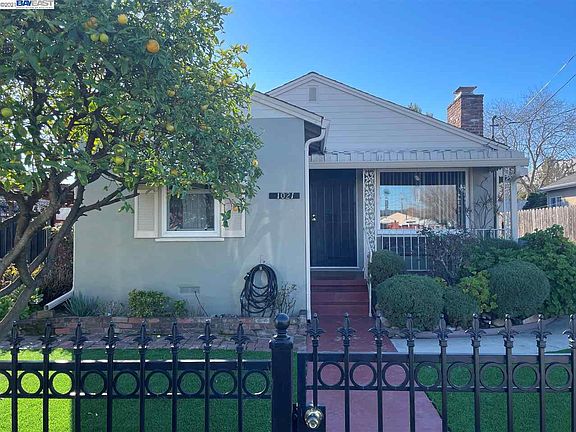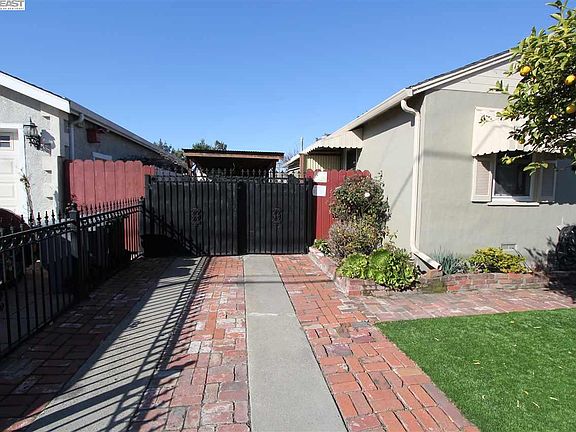 Stunning San Leandro home with many upgrades. This 3-bedroom, 1 bath with 1 car garage has an elegant living area of 963 square feet on a spacious 5,000 square feet lot. The front yard has been upgraded with astro turf and has a prominent lemon tree surrounded by a wrought iron fence. The front entry has a covered patio with decorative metal awnings on all the windows. The windows have been upgraded to dual pane. The deep backyard includes a stamped concrete patio with lemon and chili trees. The main door opens to a family room with beautiful wood burning fireplace with brick hearth. There are wood floors throughout. Stall shower in bathroom and tile floors. The kitchen features granite floors and countertops with full backsplash and white painted cabinets, 4 burner gas range, refrigerator. The kitchen has a dining area with a ceiling fan and hardwood floors. Two of the bedrooms have ceiling fans and the front bedroom has access directly to the exterior. Convenient location...