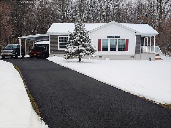 Beautiful, bright & open floor plan is what you will find in this newer home in immaculate condition at "Quiet Country Estate." This spacious Champion Titan model home features paved driveway with carport leading into home. Large living room allows you plenty of room with stunning modern classy fireplace with mantle/storage above. Top of the line white cabinetry with plenty of counter space and all newer appliances included. Dinette area with glass sliding doors leads out to deck facing the woods with stairs to private yard. Master bedroom features full bath with walk-in shower & walk-in closet. Opposite side of home offers guest bedroom of good size and full bath. Laundry room is just a few steps away along with additional storage & 10x12 shed stays. This home sits on private setting with woods behind, side porch, back deck and carport offers all the convenience needed. This is a must see and needs 24 hr. to show to qualified buyers.