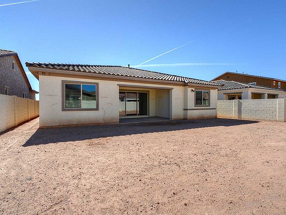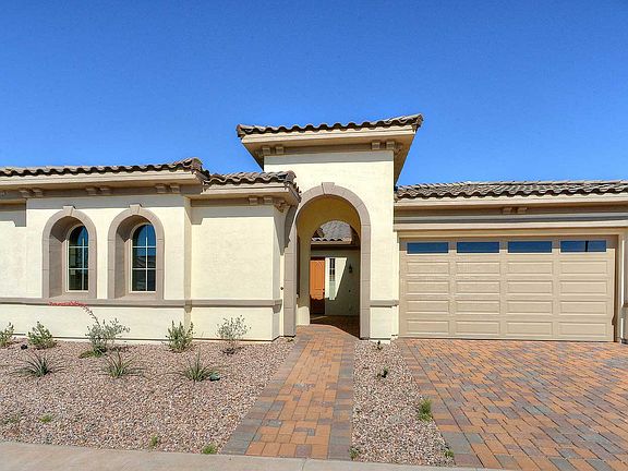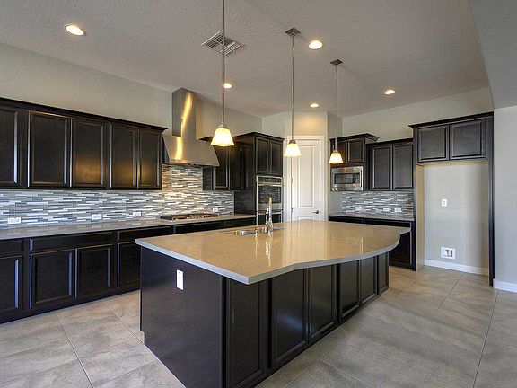 Beautiful new home at Palladium Point in Eastmark featuring Stainless Steel gourmet kitchen appliances with 36" gas cooktop, quartz kitchen countertops, espresso kitchen cabinets, pendant lights over island, box window at master bedroom, wood framed mirrors at master bath, coffered ceiling at foyer, 12' sliding glass door, 8' interior doors, sink at laundry room, two-tone interior paint, 18" tile, gas line at patio, and so much more.