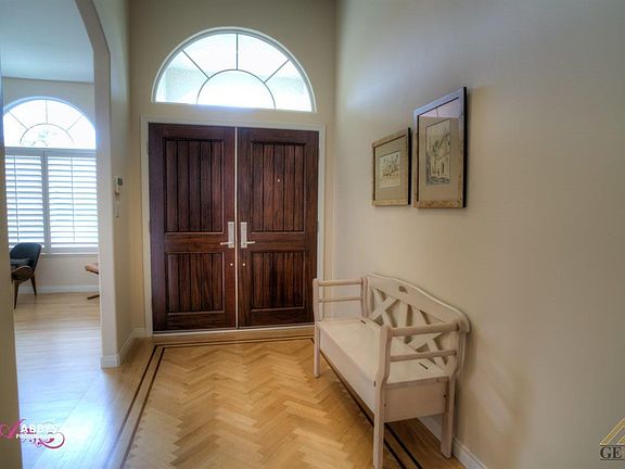 Beautiful Seven Oaks home with heated pool and spa and spectacular hardwood floors. Gorgeous kitchen with granite countertops, full granite backsplash & island and travertine floors. Newer stainless appliances including a double oven & 2 pantries w/ one walk-in. Great room & separate dining/living area. Custom plantation shutters on all windows in home. Large Master bedroom features retreat area that can be used as an office, walk in closet & separate tub & dual sinks. Nice secondary bedrooms. Backyard has a heated pool and spa. Pool has double waterfalls and several ledge areas in pool. Backyard converted to low maintenance drought tolerant plants and there are 2 separate patio cover areas. The half bath is accessible from backyard. Large laundry room with many cabinets & sink. Home is extremely well maintained! Walking distance to Ronald Reagan Elementary. Deer Peak Park located at end of street featuring playgrounds, basketball, picnic and BBQ areas. Near CSUB and The Marketplace.