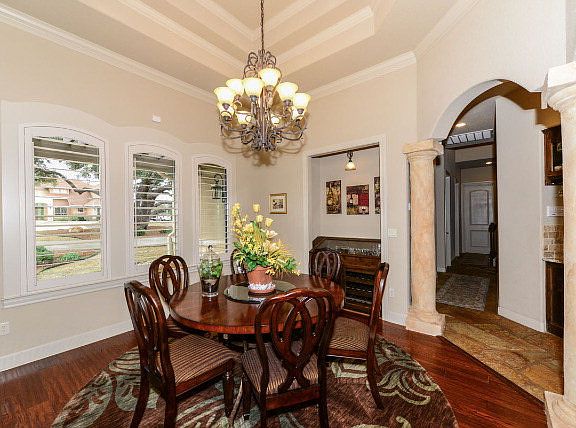 Beautiful 1.5 story home in Rockwall Ranch on 1.2 acres. Beautiful low maintenance landscaping w/3 car garage! Flagstone flooring in community areas. Huge open kitchen w/island, stainless steel appliances, granite counter tops, and breakfast bar. Living room is open to the kitchen w/recessed lighting, fireplace, & tray ceiling. Master bth has large soaking tub & oversized shower w/his & her vanities. Upstairs media room & bed & bath! Bckyd great for entertaining w/outdoor kitchen area, in-ground pool & spa!