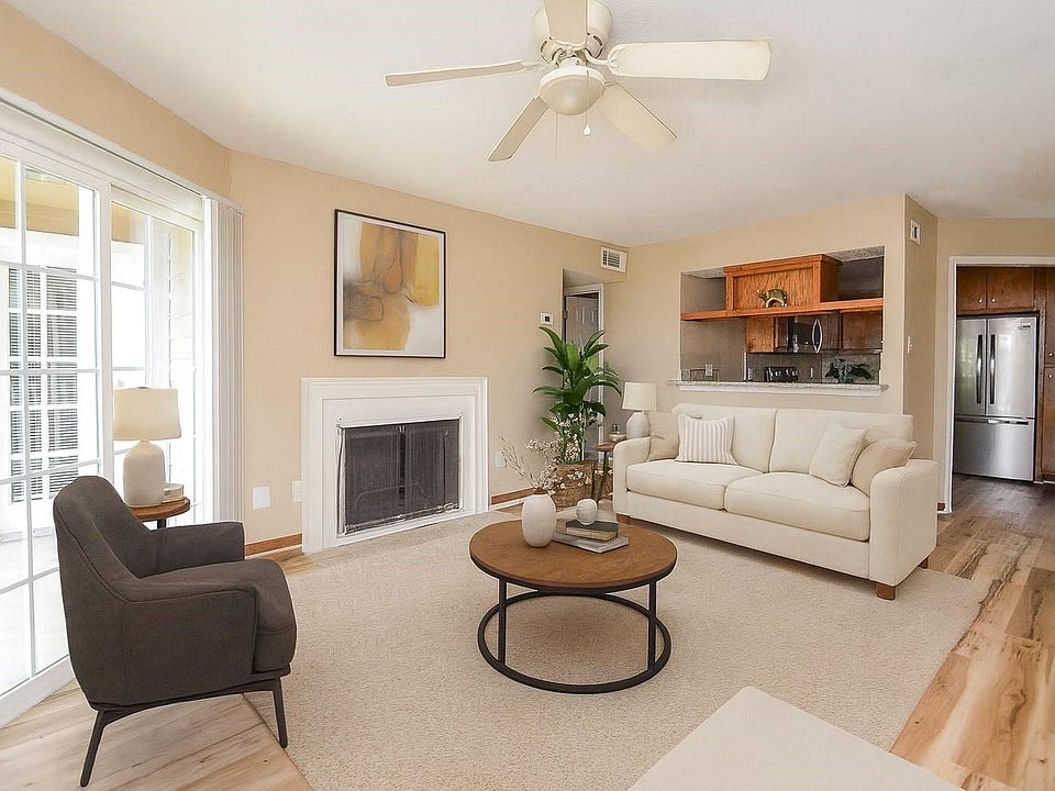 Adorable 2/1 Condo. Step inside to a spacious living room with a fireplace and sliding doors which lead to the balcony. Expansive windows fill the unit with abundant natural light. Open kitchen featuring a convenient breakfast bar, granite counters, and stainless steel appliances for easy cleanup. Start your mornings right in the bright breakfast area. The primary bedroom offers direct access to the balcony. Both bedrooms boast two walk-in closets for ample storage. The tiled balcony provides a comfortable spot to unwind. Unit located on the second floor for added privacy. Refrigerator included. Gated Complex, enjoy the Tennis Court and Swimming Pool. Don't miss it schedule your showing today!