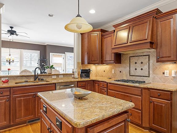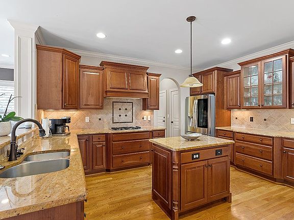 Architectural detail abounds in this beautiful custom home in desirable Porto Fino neighborhood in Wake Forest. Cul de sac home sits on a wooded lot conveniently located to schools and shopping. Separate dining and living rooms. 1st floor owner’s suite features a soaking tub, separate shower, dual sinks and large walk-in. 3 additional bedrooms on 2nd floor and bonus perfect for media room, 2nd family room or home office. 3 out of 4 bedrooms have walk-in closets. Granite counters, stainless steel appliances and large pantry, make this eat-in kitchen perfect for any chef. Hardwood floors throughout first floor. See through fireplace. Plenty of storage. Beautifully landscaped exterior with gas lighting. Two additional floored attic spaces measuring a total of 522sq. ft. provides for excellent storage space. There is also a 12x12 crawl space workshop! Gas hookup in backyard for fireplace or grill.