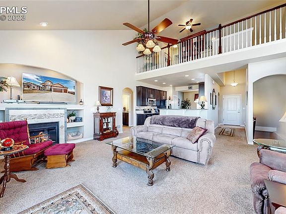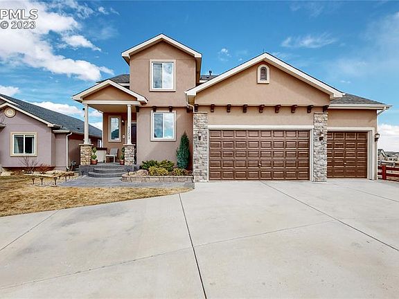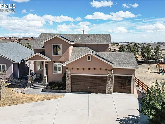 This immaculately maintained 2 story home is located on a quiet cul-de-sac within the lovely Meridian ranch community, only 20 minutes to Colorado Springs. A former model home and Parade of Homes winner, it is loaded with upgrades and amenities galore. You will be amazed at the almost-new condition that belies its age! The large eat-in kitchen comes equipped with granite counters, a large pantry, all appliances that includes a quiet Bosch dishwasher, eating nook that has a computer connection wall monitor wiring in the wall, plus lovely hardwood floors. In the living room, the large windows flood the room with natural light while the fireplace adds ambience. The built-ins around the fireplace add hand storage and even doggy beds! The thoughtful owner installed a large shelf above the fireplace to accommodate up to a 75 inch TV, with a USB port in the wall nearby. The primary bedroom is on the main level with sun protection shield on the windows, vaulted ceilings and room for your king size bed! The primary 5 piece bath and walk-in closet shows much attention to detail as well, with shoe shelving, jewelry hangers, mirrors and lots of hanging space and shelving. Upstairs are two good-sized bedrooms, a handy loft area, and even Pikes Peak views. The basement is fully finished with a large rec room, extra storage, two additional bedrooms and a full bath. Other upgrades: Whole house HEPA air filter for hospital quality air, whole house humidifier works year-round; Smart AprilAire thermostat; new whole garage LED lighting, peg board storage; garage openers & remotes for both doors, finished garage floors. Under the newly upgrade composite deck is a hidden shed/workshop complete with electricity; newer paint; lovely mature landscape with lighting, newly sodded in 2022, 5 zone sprinkler system. Located in the growing Falcon community with near-by shops and restaurants, you will love this dearly loved home and amazing area! See this rare beauty soon!