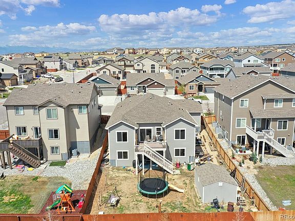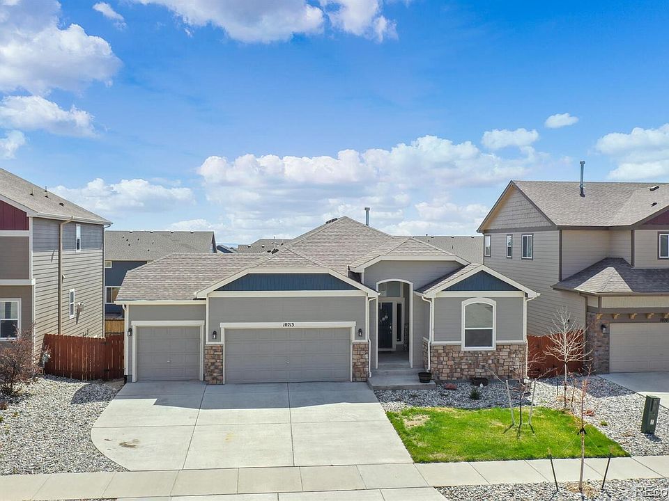 Come and fall in love with this beautiful Meridian Ranch walkout ranch home with main level living! Beautiful engineered wood flooring welcomes you into the home and continues throughout the Great Room and kitchen! Great open-concept floorplan with sliding doors that lead from the Great Room to your low-maintenance Trex deck! The gourmet kitchen is the heart of the home and sure to please the entire family! This area features a large island with seating, gleaming granite countertops, dark wood cabinets, stainless steel appliances, a gas cooktop and a pantry for storage! Adjacent to kitchen is an eat-in area for your more casual meals. An arched walkway leads to the formal dining room which can also be used as a home office or a bonus room should you wish! The primary retreat is spacious and has a 2-sided fireplace to enjoy from the bedroom or the private 5-piece en-suite with granite countertops and a large soaking tub! Completing the main level is another bedroom, full bathroom and a laundry room that leads to your attached 3-car garage! The fully finished walk-out basement provides plenty additional living space, 3 more bedrooms and 2 more full bathrooms! One of the bedrooms has private access to a full bathroom making it ideal for an in-law suite or overnight guests! The large, fully-fenced backyard has a deck and patio area to enjoy entertaining family and friends! BONUS SHED included! The metro district includes water, sewer and access to the recreational center with fitness center and pool to enjoy! This house is move-in ready and waiting for you to call it HOME! Hard-to-Find Walkout Rancher - newer Built & 3 Car garage + a Junior Suite in the basement - This one checks all the boxes! See it QUICK!
