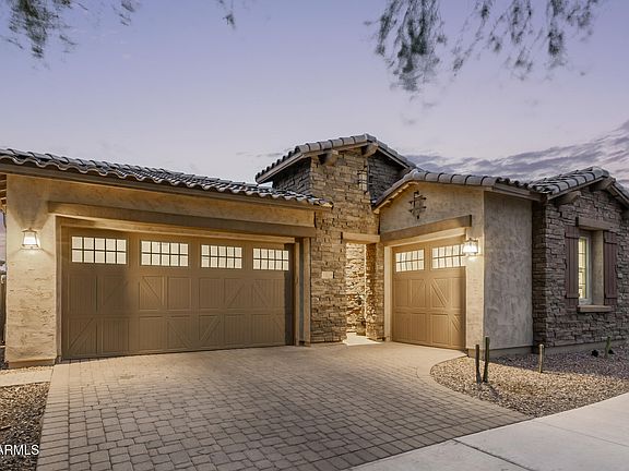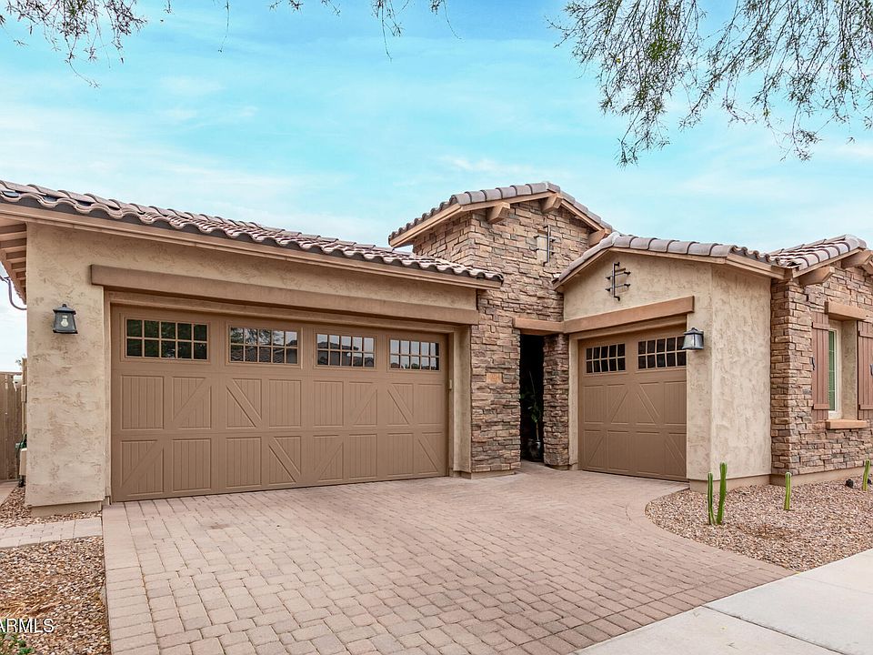This gorgeous 3-bedroom + den gem awaits you in the sought-after Curie Court at Eastmark! The stunning facade, 3-car garage, and lovely courtyard invite you to take a look inside, where you'll find generous living areas with tile flooring, arched passageways, sliding doors to the backyard, and neutral colors. The impeccable culinary space boasts staggered cabinetry with crown molding, tile backsplash, granite countertops, SS appliances, and an expansive island with a breakfast bar. The main bedroom hosts a walk-in closet and a bathroom with dual sinks. The den is perfect for an office. Out back, you'll have your private backyard, complete with a cozy covered patio ideal for morning coffee and quiet evenings, a grassy area, and ample space for outdoor fun! What's not to love? Don't miss it