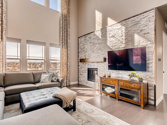 Stunning Sierra Ridge home adjacent to park abounds with designer updates and mountain views. Family hub features 2-story great room w/ fireplace refinished with spectacular wall-to-wall stacked stone surround. Gorgeous wide-plank hardwoods throughout main. Gourmet kitchen features upgraded cabinets, stainless appliances, sleek slab granite & island w/ 4-seat breakfast bar. Dining room enjoys wall of windows & wainscot panels. Sunny main floor office. Versatile upstairs loft works as a media room or homeschool. Master suite features luxury 5P bath and his & her custom closets. Mudroom has custom bench & cubbies. Over $150k in upgrades include expanded deck with sweeping views of the front range, 5:1 surround sound in great room & loft, built-in stereo speakers in master suite and covered patio, pro landscaping, shiplap accent walls, crown molding throughout, upgraded lighting, Hunter Douglas shades & much more! Mere steps to park with basketball court. Community clubhouse & pool.