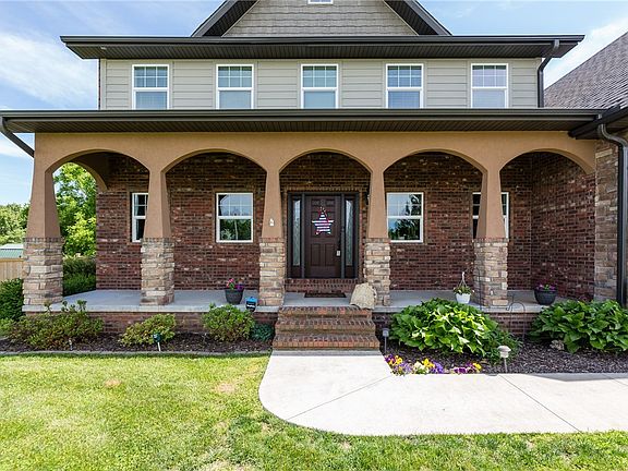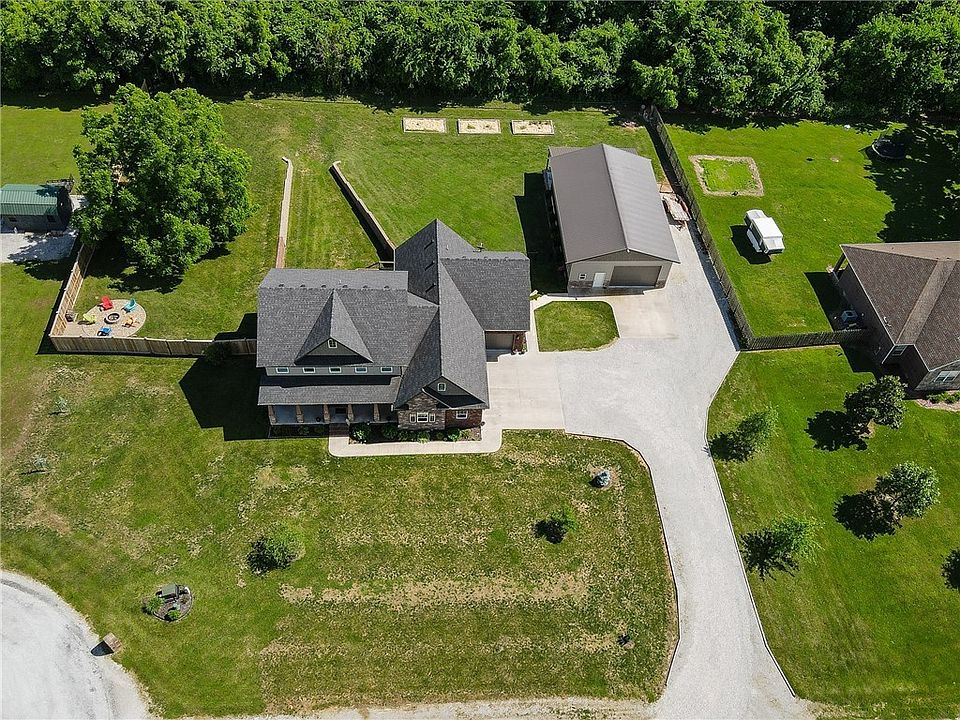 Immaculate custom 2x6 built 5 BDRM + Office, 5 ½ BATH home on over an acre! Just 40min from NWA! Hardwood floors, 3 car garage, and tons of storage! Master suite is spacious, has doors leading out to the deck, oversized closet for her, second closet for him, whirlpool tub, tiled shower, and split vanity sinks. Granite throughout, kitchen has double ovens, propane range in island, eat-in kitchen, bar seating, and adjoining dining room makes it easy to entertain! Wet bar in basement with a bedroom, bathroom, and second laundry is perfect in-law suite. Another living space (3 total!) upstairs. The 33x51 matching shop has kitchenette and plenty of storage. Nice privacy in fenced in backyard with fire pit and raised garden beds. Fiber Optic Internet, 2 water heaters, 2 HVAC units and great utility costs!