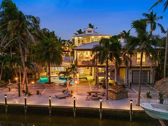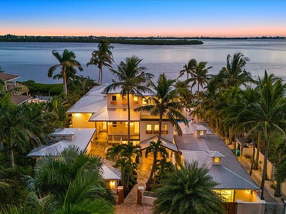 Nestled behind custom gates on nearly 0.83 acres of lushly landscaped tropical grounds, this one-of-a-kind, gated bayfront estate blends secluded serenity with unrivaled luxury. Moments by boat from the Gulf of Mexico, the property welcomes you via a sweeping drive lined with palms, revealing a motor court that provides access to the main residence, a charming cottage, a guest apartment, and the poetic “Owl’s Nest.” Inside the main home, you’ll find an entertainer’s dream a grand great room with a gas fireplace opens to sweeping bay views, accompanied by a chef’s kitchen outfitted with Wolf and Sub-Zero appliances, dramatic built-in wine storage, and a stunning Forno Bravo pizza oven. Custom stone and wood finishes, soaring arches, and elegant moldings underscore the craftsman-level quality throughout. The primary suite is a tranquil retreat with a cozy fireplace and steam shower, while additional guest suites offer comfort and privacy. Outdoors, the property shines with a tiki hut, resort-style freeform heated pool, and a fully equipped outdoor kitchen and living area that beckons relaxing evenings by the bay. Water access here is sublime with approximately 100 feet of protected water frontage, a covered boat lift, expansive dock with charging, all positioned to enjoy daily visits from dolphins and manatees against the backdrop of breathtaking sunsets. Located minutes from upscale shopping, fine dining, and Gulf beaches, this unparalleled compound is not just a home it’s a peaceful, private paradise designed for lavish entertaining, family memories, and luxurious coastal living.