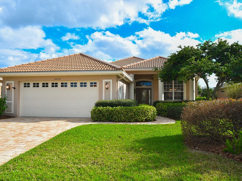 Amazing 3 bedroom 2 bath maintenance free home with peaceful water views located in the desirable golfing community of River Club. You'll notice the mature landscaping as you walk up on the pavers to the front entry. Walk inside to an open and inviting floor plan complete with hardwood floors through the living room, dining room, hallways and bedrooms. Open concept kitchen with ample cabinet space, granite counters and stainless steel appliances. Multiple eating space options with your nook area just off the kitchen with water views and a great formal dining area. You'll love the custom trim work throughout with the enjoyable architectural lines and design. The vaulted spacious living room is a great place to relax or enjoy some company or you can head out to your screened in lanai with amazing water views. Master suite is complete with double vanity, tub and separate tiled shower. Oversized 2 car garage with golf cart side entry and epoxy floors. Exterior was just painted (2019) Community pool is a short walk away. River Club is an optional golf community located close to everything including I-75, restaurants and shops.